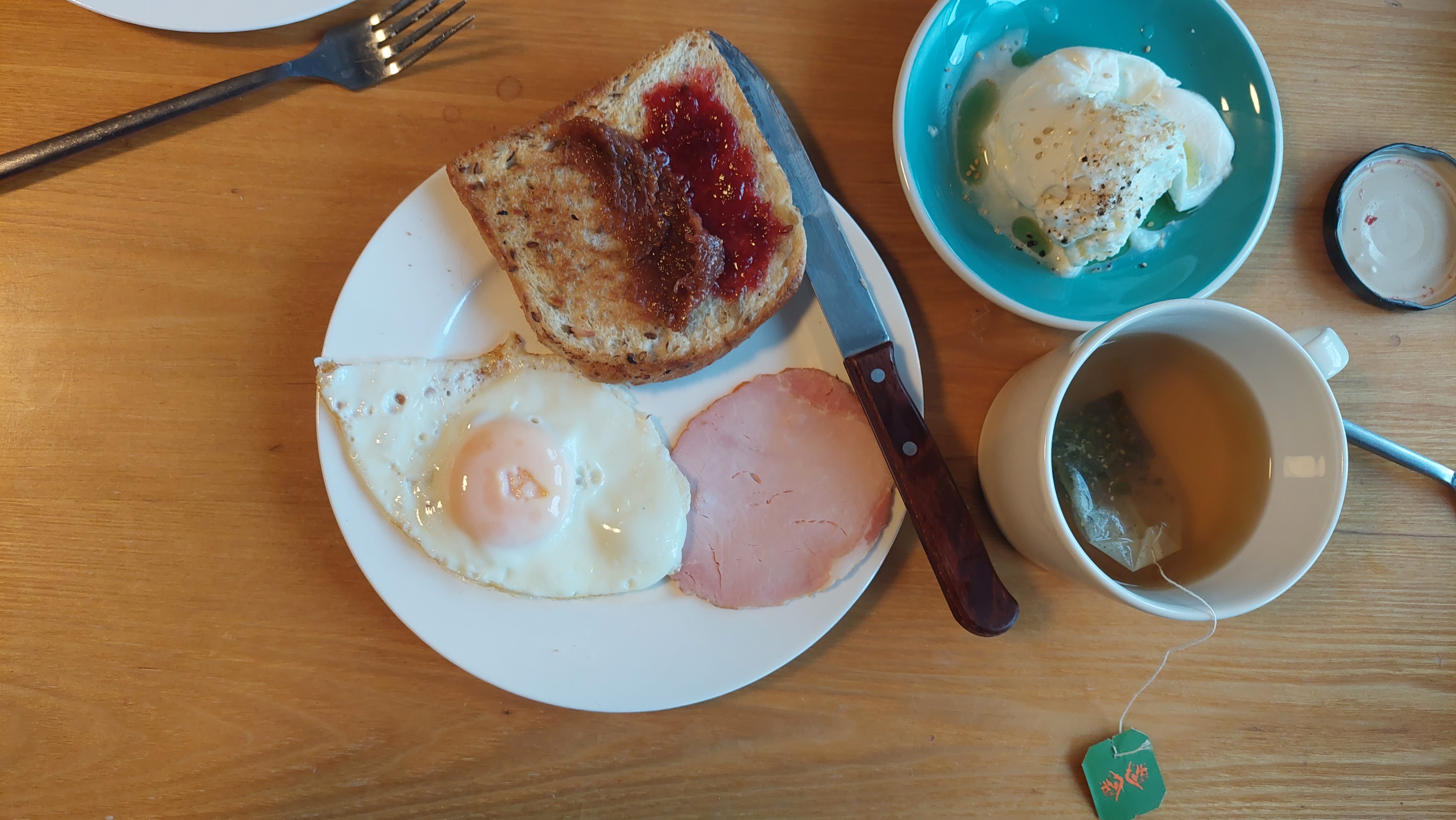 가진 잼 모두 발라서 겨란 후라이와 고기 한 점. 굳이 겨란 후라이라고 하면 양양 큰집의 부엌에 여물 끓이는 아궁이 근처 위에 앉아 있을 때 친척언니가 겨란 후라이라면서 부쳐주던 게 생각난다. 아궁이 속에서 타고 있던 장작향이 입혀진 건지 약간 곤로 위에서 만든 듯한 그 후라이 특유의 냄새도 같이 기억에 딸려 나온다.