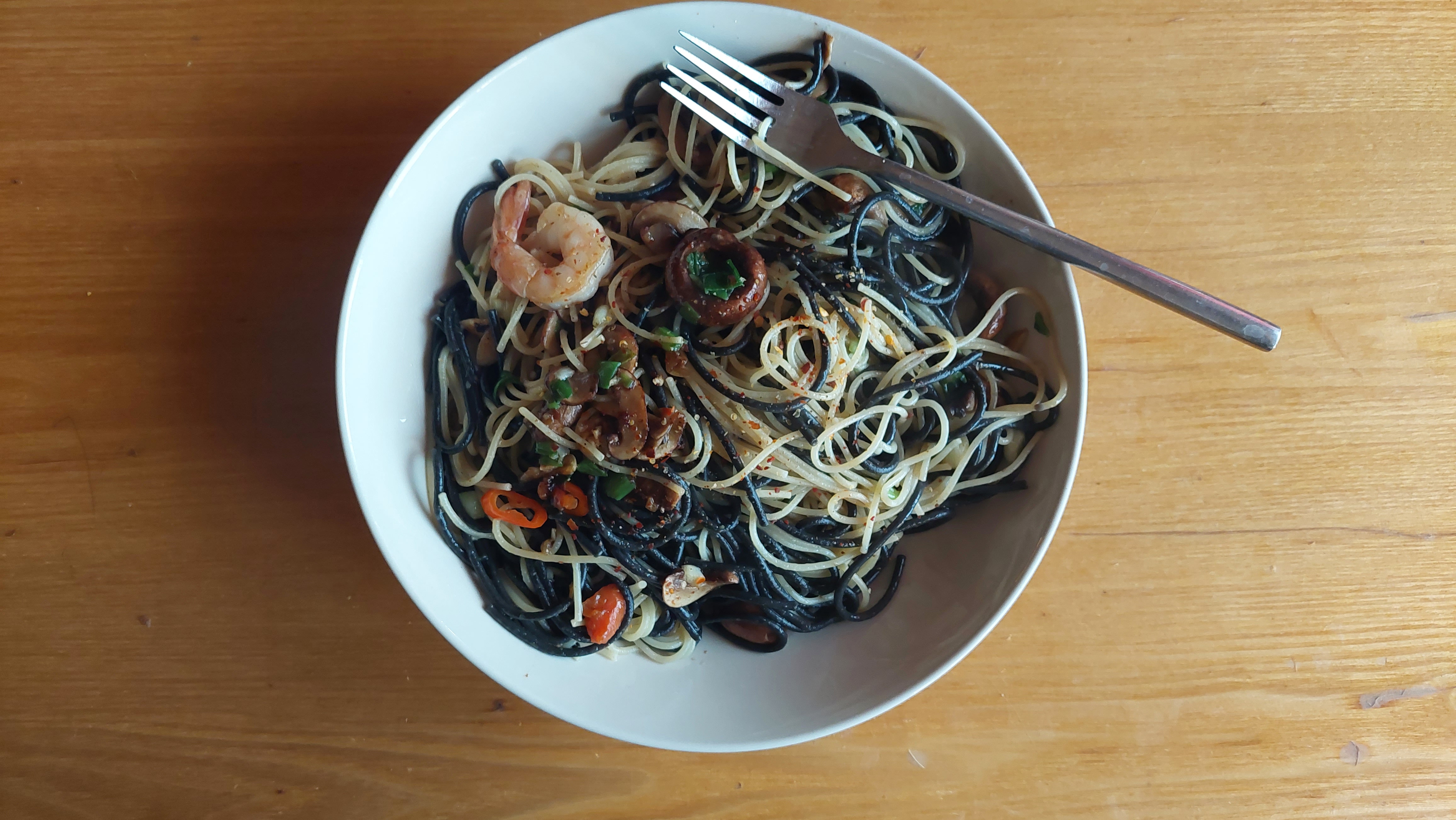 가끔 머리를 묶으려고 한 줌에 쥐면 뭔가 많이 줄어든 느낌이 들어 당혹스러울 때가 있다. 어떤 봉지에서 어떤 파스타면을 꺼내도 그 양이 파스타 한 접시에 못 미칠 때가 약간 엄지와 검지 사이에 쥐어진 그 줄어든 머리숱과 비슷한 느낌이다. 그럴 땐 그냥 이것저것 다 넣고 끓이면 된다. 하지만 면마다 삶는 시간이 다르므로 넣는 순서는 목에 칼이 들어와도 지켜야 한다. 이 파스타엔 먹물면과 일반면과 카펠리니까지 골고루 들어갔다. 먼저 검은 면을 넣고 삶다가 흑백의 면이 자연스레 서로에게 길을 터줄 무렵에 최종적으로 카펠리니를 넣고 4분 정도 더 삶는다. 부활절을 빌니우스에서 혼자 보낸 새우 한 마리와 오래된 버섯 네 개와 고추 반 개도 참가했다.
