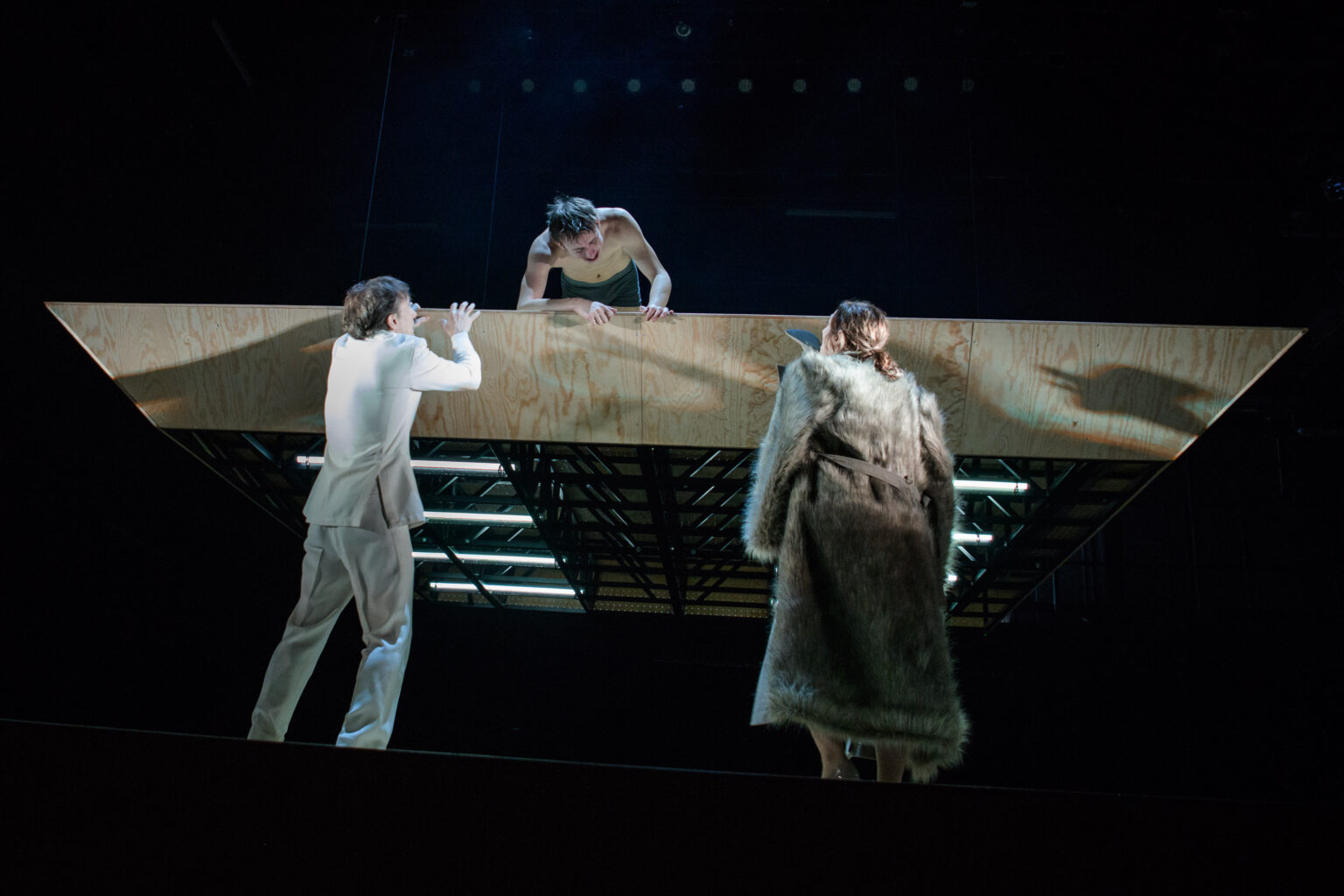 공중에 매달린 거대한 장치 위로 인물들이 올라간다. 아버지와 아들, 아내와 남편, 엄마와 아들의 불안정한 관계들, 그들이 정상적인 소통에 얼마나 애를 먹고 있는지를 보여주려 했을 그 무대 장치는 탁월했다. 그래서 저 장치가 앞으로 기울면 배우들이 잘 보였지만 높은 위치에서 수평을 유지하거나 반대로 기울면 도무지 보이지가 않았다. 하지만 그 마저도 갈등하는 두 인물 사이에서 관람객으로밖에 남을 수 없는 손발이 묶인 제삼자의 위치라고 합리화하며 연출된 세트에 감탄하는 길을 택한다.