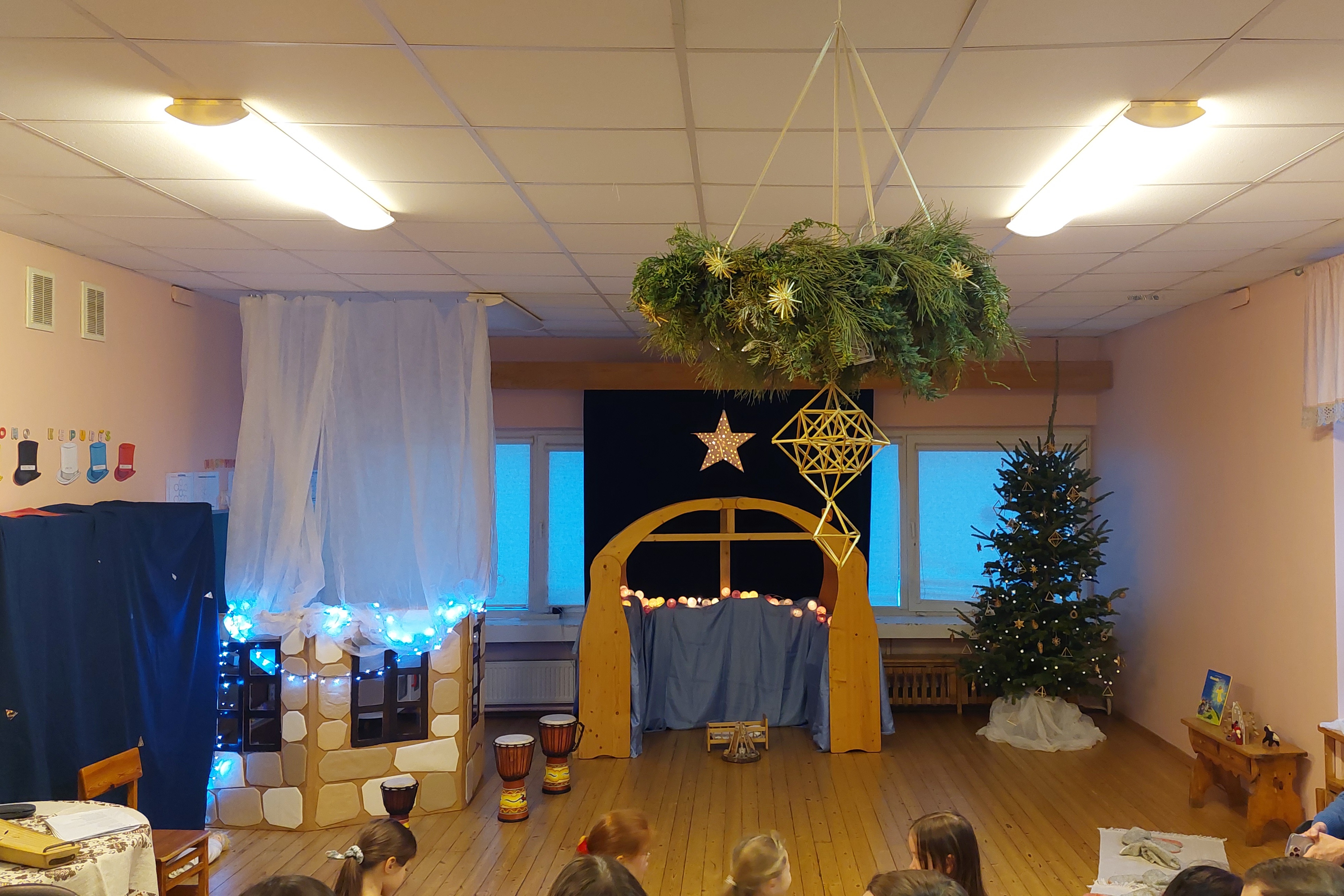 해마다 크리스마스 연휴 시작 전 유치원에서는 예수 탄생에 관한 성극 공연이 열린다. 리투아니아의 모든 유치원에서 여는 공식 행사 같은 것은 아니고 같은 유치원에서도 그룹별로 다르다. 그냥 한 해를 마무리하는 자율적인 재롱잔치 정도로 보면 된다. 유치원에서 몇 년째 보는 이 연극의 세트도 엄밀히 말하면 프라카르텔레 Prakartėlė 를 재현하고 있다. 단지 이 연극 속 말구유의 등장인물수는 그 어떤 예수 탄생 장면보다 유동적인 게 매년 원생 수도 바뀌고 모든 원생이 전부 유치원에 오는 날은 사실 드물기 때문에.