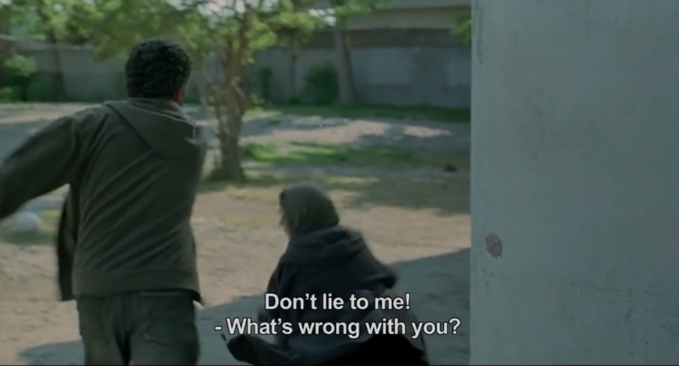 휴가를 망친 모든 원인이 아내인 세피데에게 있다고 생각한 남편은 이성을 잃는다. 감독의 전작에서 자신의 뒤를 밟은 아내에게 손찌검을 하던 모르테자를 보고 나니 세피데의 결혼 생활도 어쩌면 순탄하지 않았겠다 짐작하게 한다.